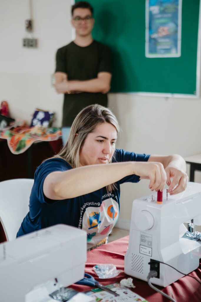 O projeto capacita mulheres em situação de vulnerabilidade social com oficinas de upcycling, corte e costura, para criar oportunidades de renda através da costura e da customização, recebendo, ainda, bolsas-auxílio, doação de máquinas novas e kits de costura. O curso tem duração de 05 dias e encerra com uma feira expositiva para comercialização dos produtos criados pelas alunas. As 8 mulheres que mais se destacarem recebem uma capacitação específica em gestão têxtil.