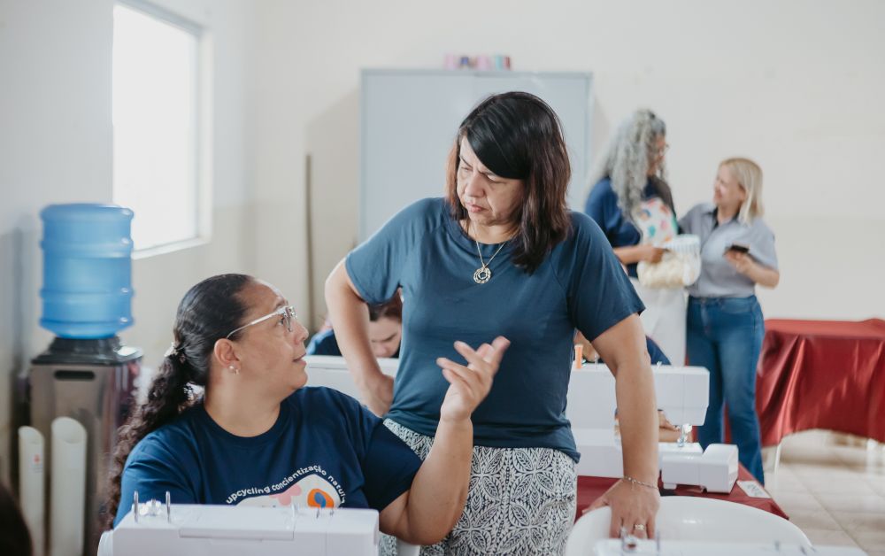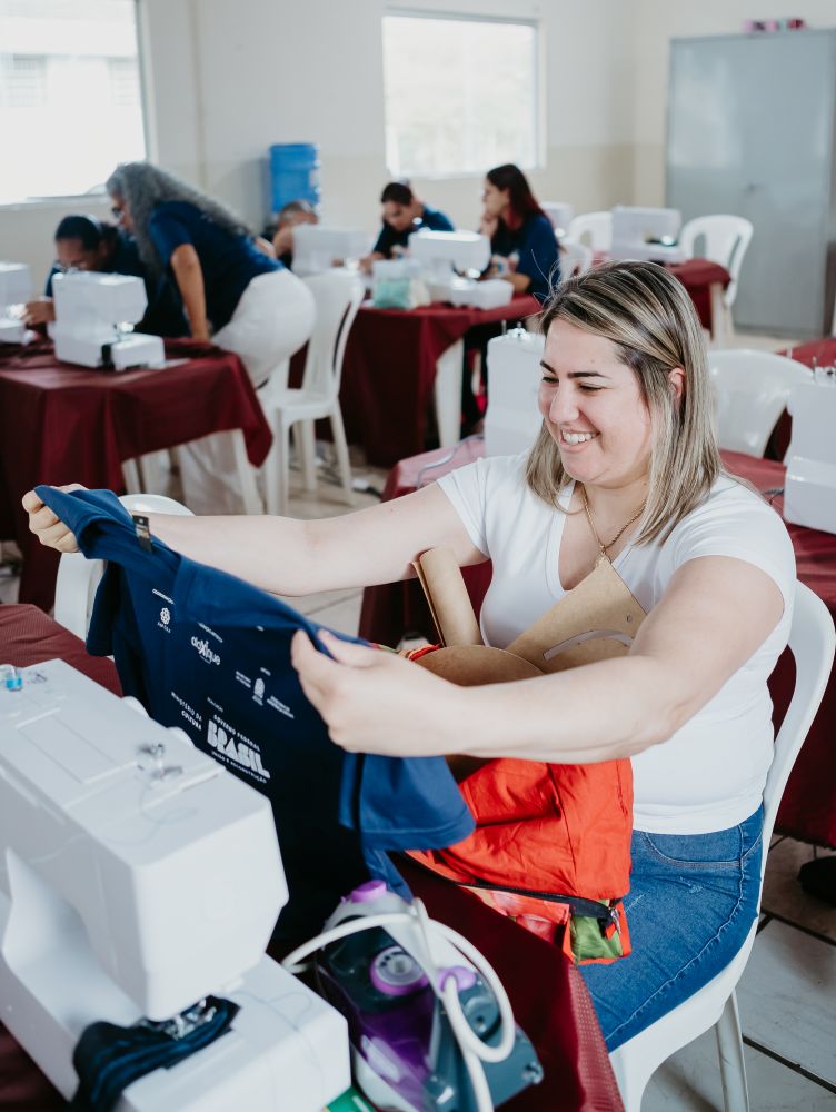 Ao final das aulas, todas levam seus materiais e peças produzidas para casa, junto com uma máquina de costura novinha!
